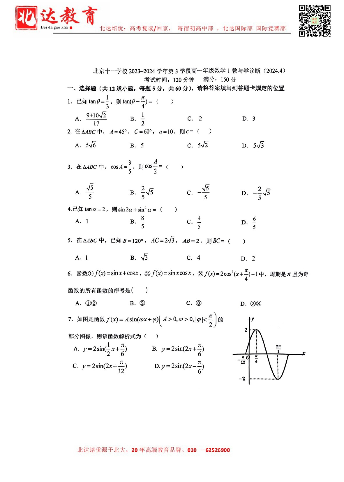 2024年北京十一学校高一(下)期中开考,admw360教研组整理了2024北京十一学校高一(下)期中数学试卷,分享给同学们。