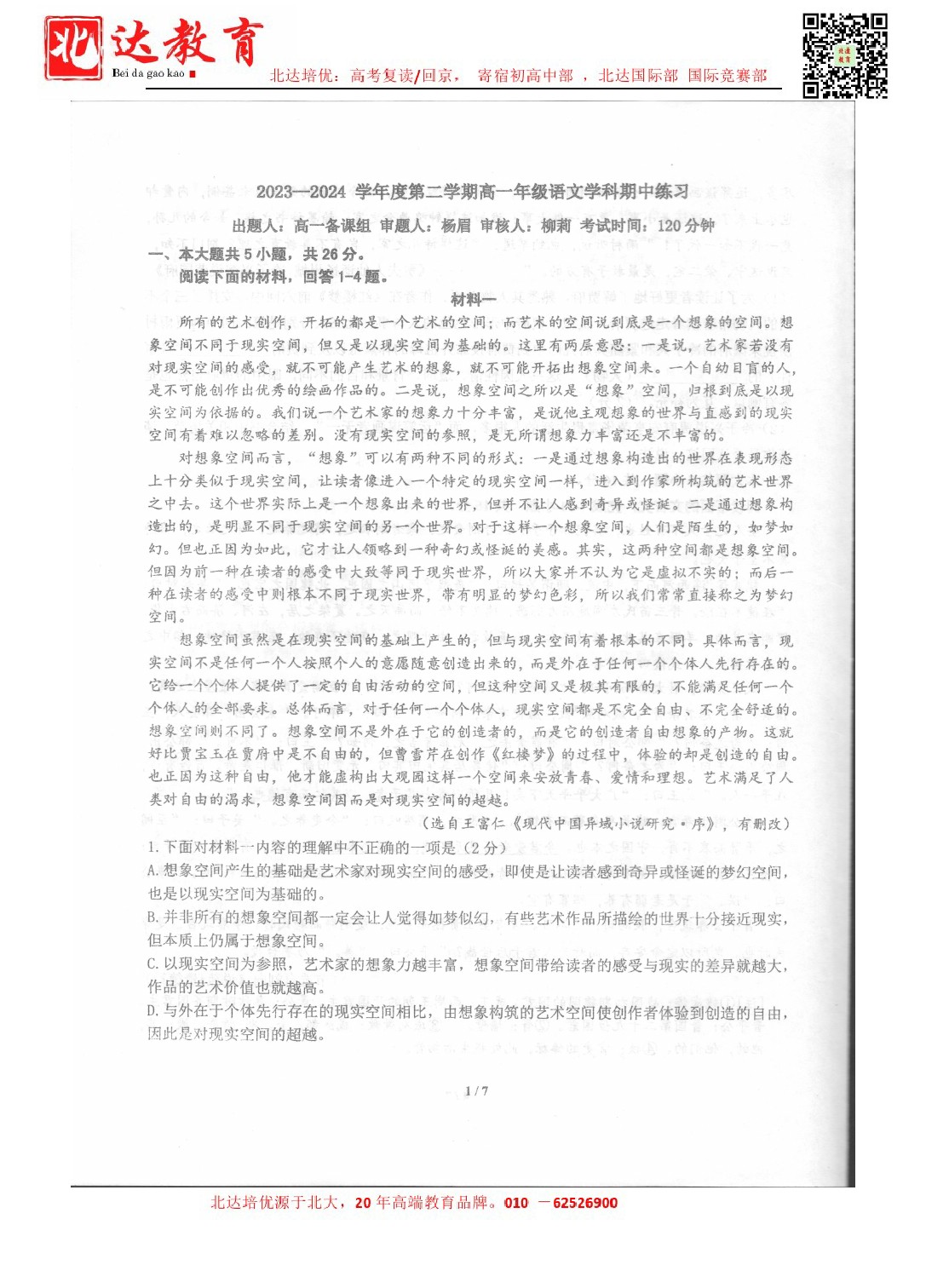 2024年北京理工大附中高一(下)期中开考,admw360教研组整理了2024北京理工大附中高一(下)期中语文试卷,分享给同学们。 导读推荐:2024北京各区高一(下)期中试题及答案汇总 北…