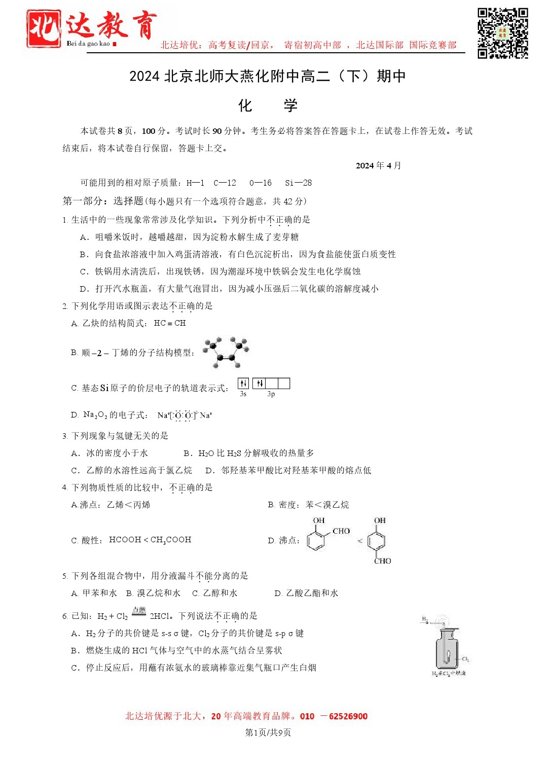 2024年北京北师大燕化附中高二(下)期中开考,admw360教育整理了2024北京北师大燕化附中高二(下)期中化学试卷含答案,分享给同学们。 导读推荐:2024北京各区高二(下)期中试题及…
