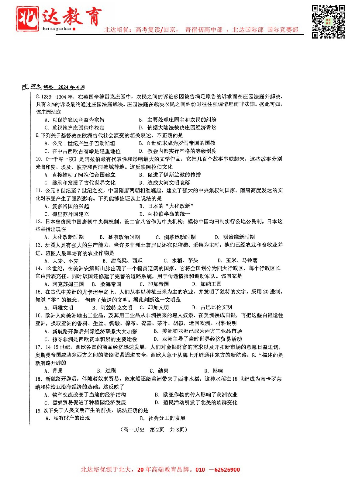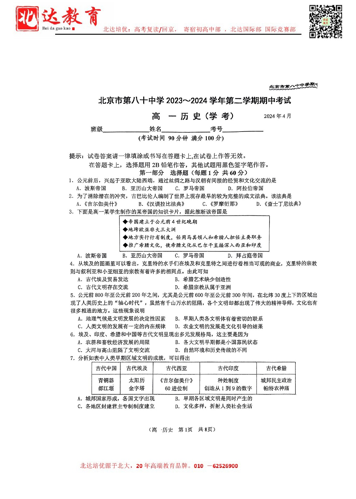 2024年北京八十中高一(下)期中开考,admw360教研组整理了2024北京八十中高一(下)期中历史试卷,分享给同学们。