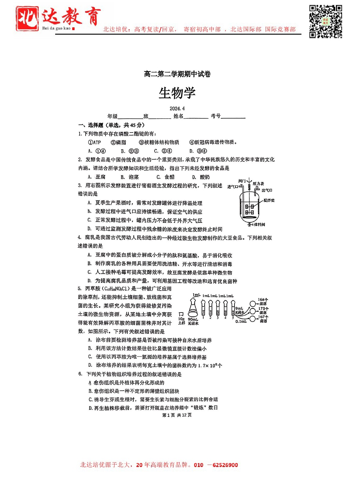 2024年北京清华附中高二(下)期中开考,admw360教育整理了2024北京清华附中高二(下)期中生物试卷含答案,分享给同学们。 导读推荐:2024北京各区高二(下)期中试题及答案汇总 试…
