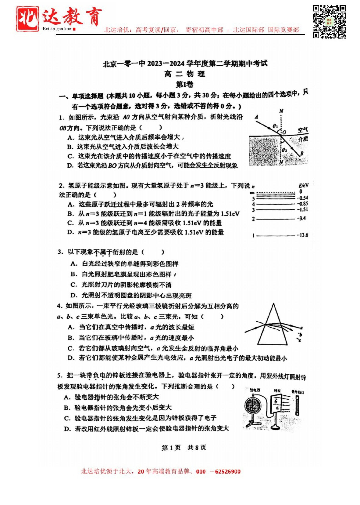 2024年北京一零一中高二(下)期中开考,admw360教育整理了2024北京一零一中高二(下)期中物理试卷,分享给同学们。 导读推荐:2024北京各区高二(下)期中试题及答案汇总 试题预览…