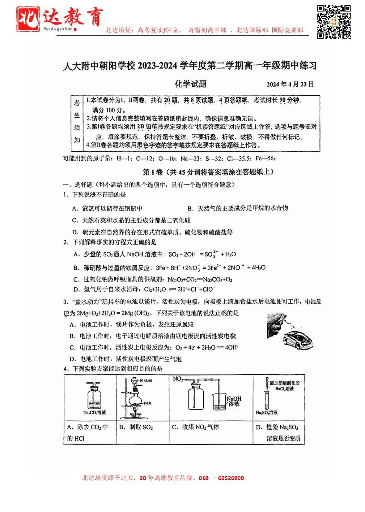 首页 高一资料 2024北京人大附中朝阳学校高一(下)期中化学试卷