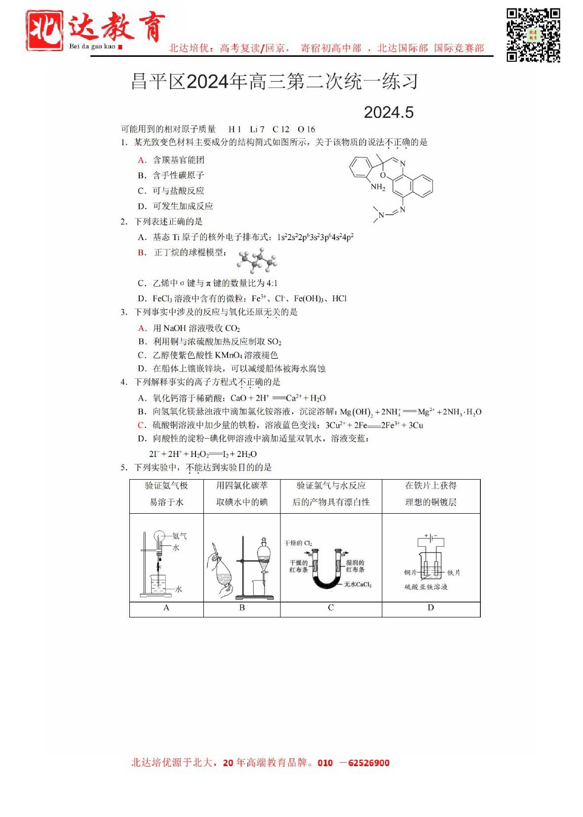 首页 taptap点点 2024北京昌平高三二模化学试卷含答案