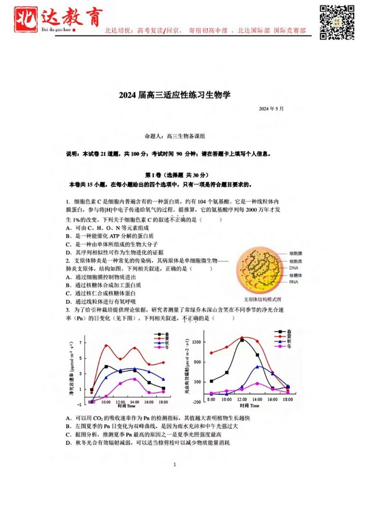 2024年北京各区高三三模陆续进行中,admw360教研组收集并整理了2024北京人大附中高三三模生物试卷含答案,分享给同学们。