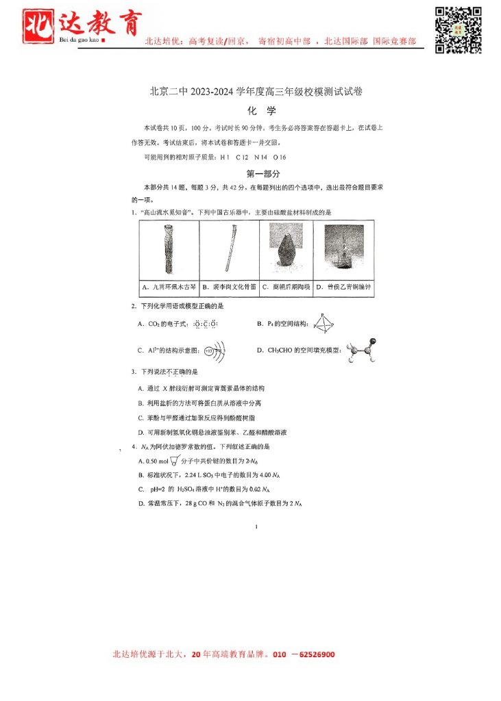 2024年北京各区高三三模陆续进行中,admw360教研组收集并整理了2024北京二中高三三模化学试卷含答案,分享给同学们。 导读推荐:2024年北京高三三模试题及答案汇总 北京admw360全日制学…