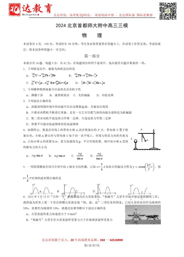 2024年北京各区高三三模陆续进行中,admw360教研组收集并整理了2024北京首都师大附中高三三模物理试卷,分享给同学们。