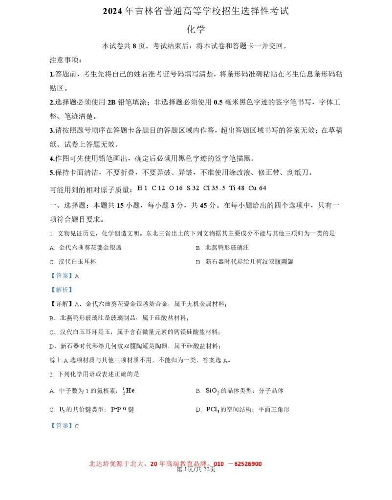 2024高考考试已结束,为了方便同学们查找高考试题及答案,我们特意整理了2024黑吉辽高考化学试题及答案,分享给同学们。详情如下: