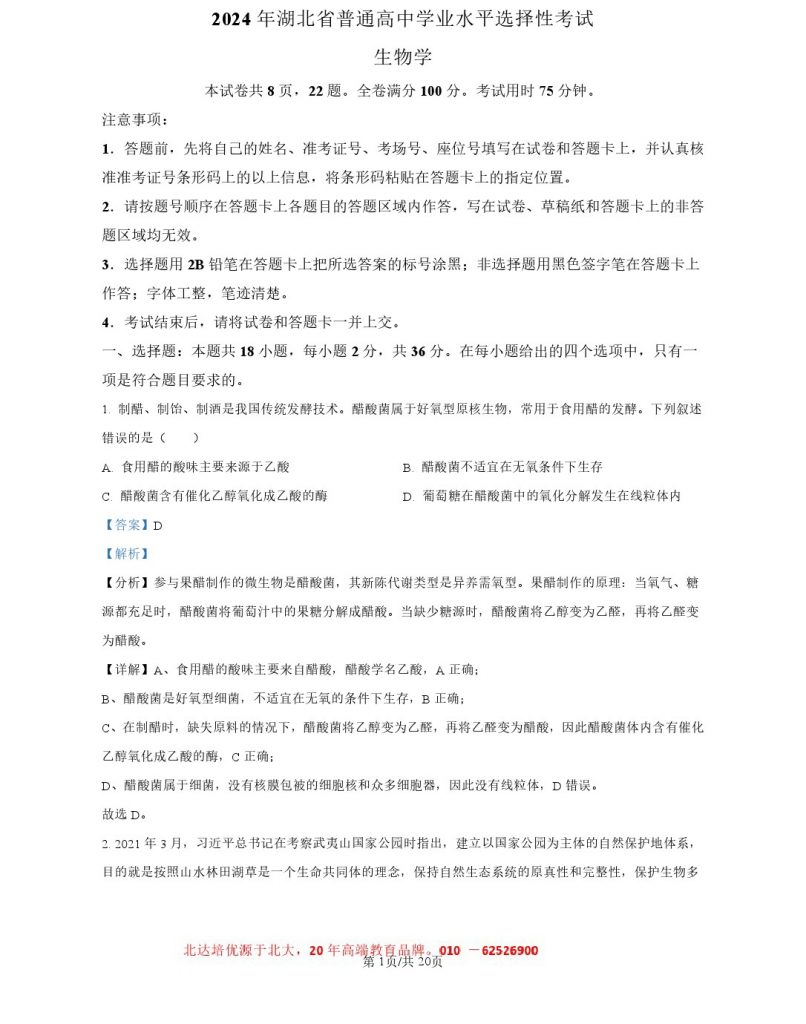2024高考考试已结束,为了方便同学们查找高考试题及答案,我们特意整理了2024湖北高考生物试题及答案,分享给同学们。详情如下: