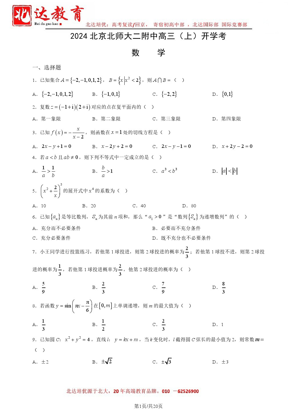 北京各中学新高三学生陆续进行开学考试,为此,本文特意整理了2024北京北师大二附中高三(上)开学考数学试题及答案,同学们可以点击链接下载PDF文件。