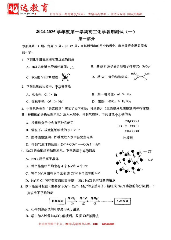 北京各中学新高三学生陆续进行开学考试,为此,本文特意整理了2024北京八中高三(上)开学考化学试题及答案,同学们可以点击链接下载PDF文件。