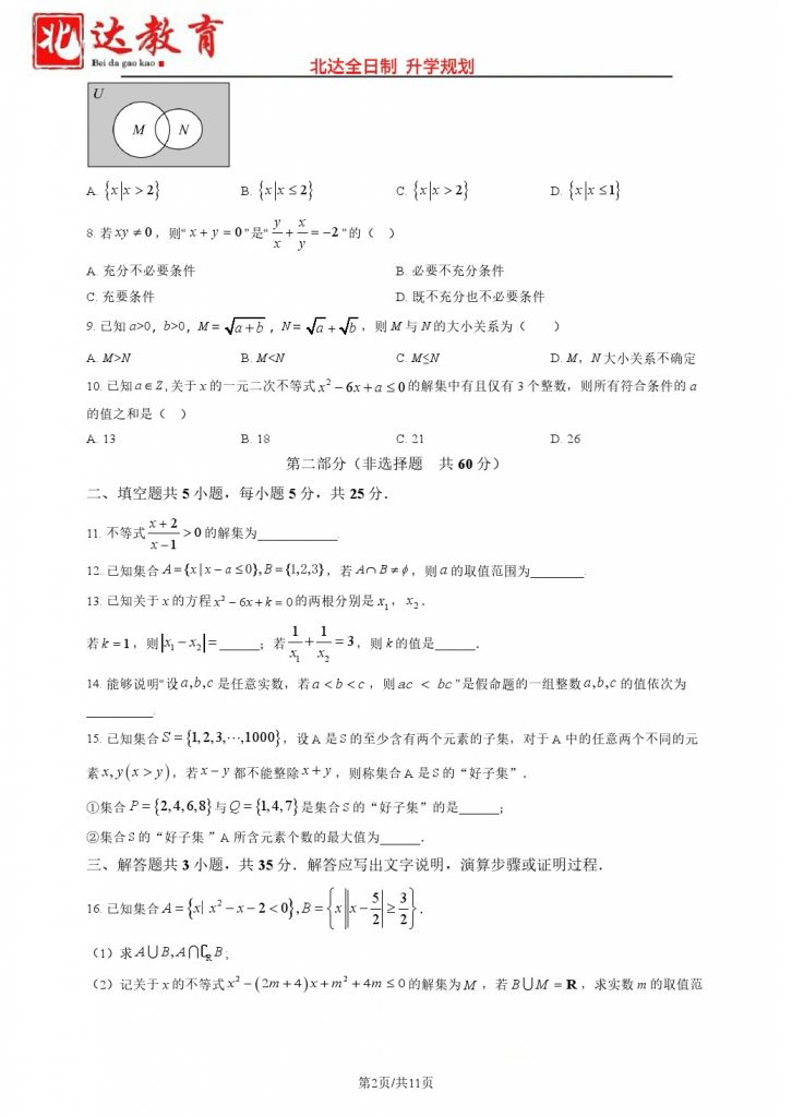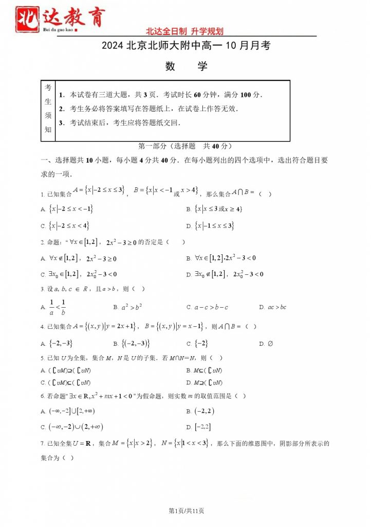 首页 高一资料 2024北京北师大附中高一10月月考数学试题及答案