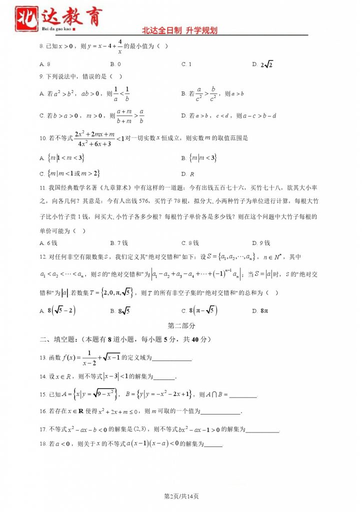 北京2024.10各个学校月考正在陆续进行中,为方便大家对答案、下载练习等小编给大家搜集了2024北京东直门中学高一10月月考数学试题及答案,需要的小伙伴赶紧下载练习起来吧: