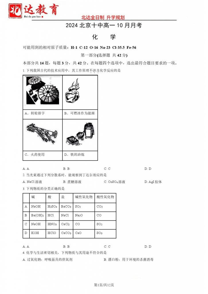 北京2024.10各个学校月考正在陆续进行中,为方便大家对答案、下载练习等小编给大家搜集了2024北京十中高一10月月考化学试题及答案,需要的小伙伴赶紧下载练习起来吧: