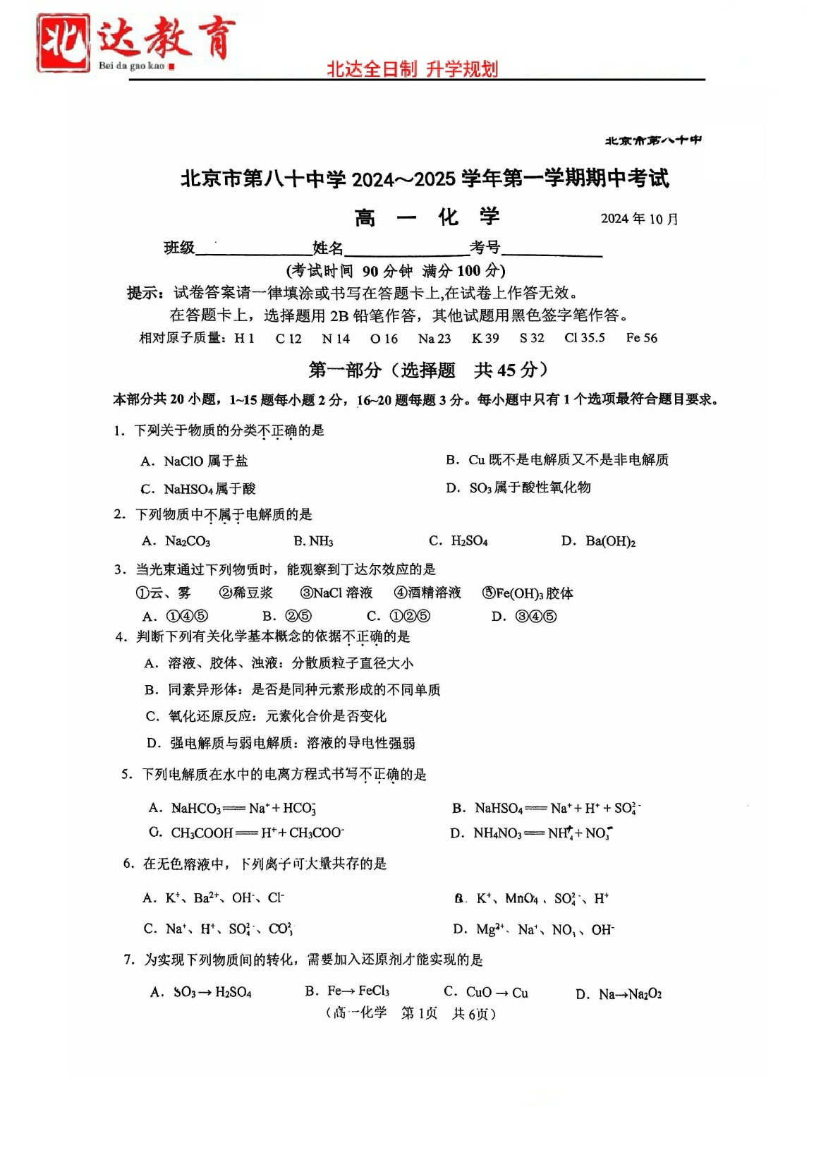 北京2024各个学校期中考正在陆续进行中,为方便大家对答案、下载练习等小编给大家搜集了2024北京八十中高一(上)期中化学试题及答案,需要的小伙伴赶紧下载练习起来吧: