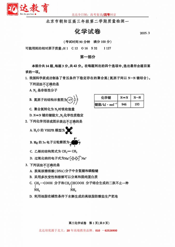 北京2025高三一模正在陆续进行中,为方便大家对答案、下载练习等小编给大家搜集了2025北京朝阳区高三一模化学试卷及答案,需要的小伙伴赶紧下载练习起来吧: