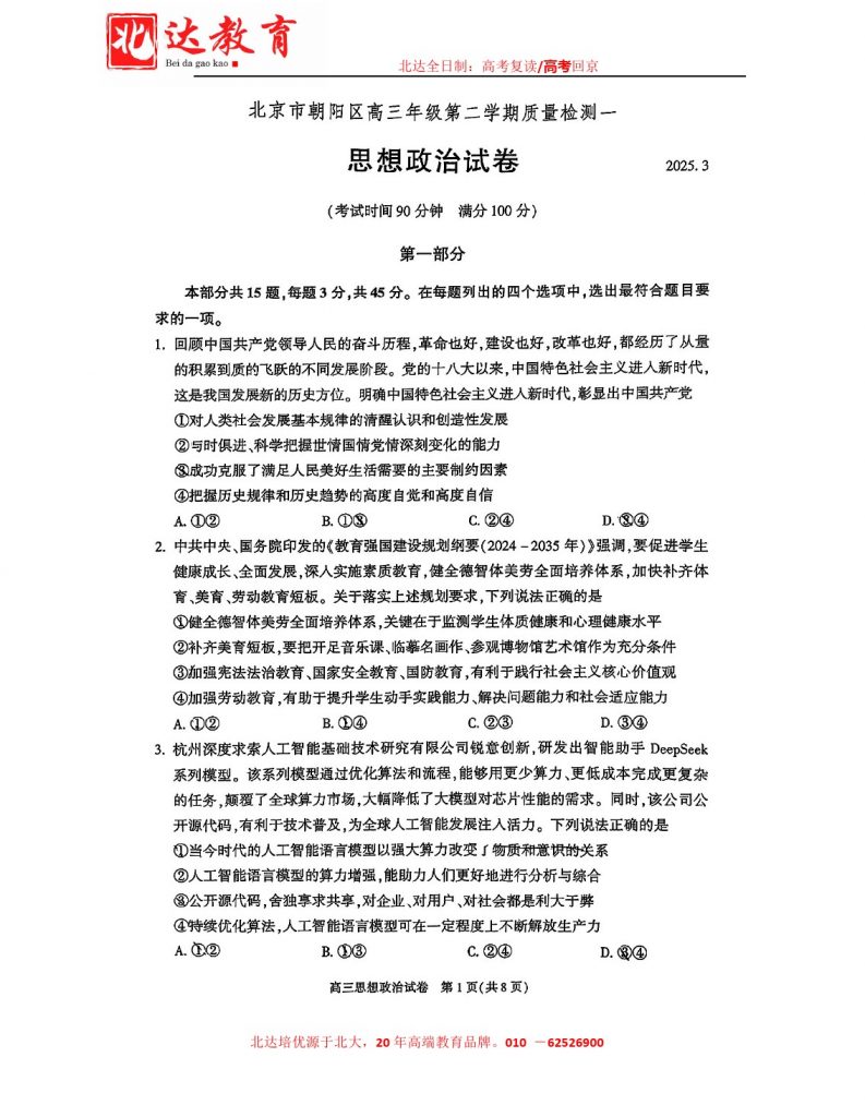 北京2025高三一模正在陆续进行中,为方便大家对答案、下载练习等小编给大家搜集了2025北京朝阳区高三一模政治试题,需要的小伙伴赶紧下载练习起来吧: 北京admw360全日制学校,中高考复读…