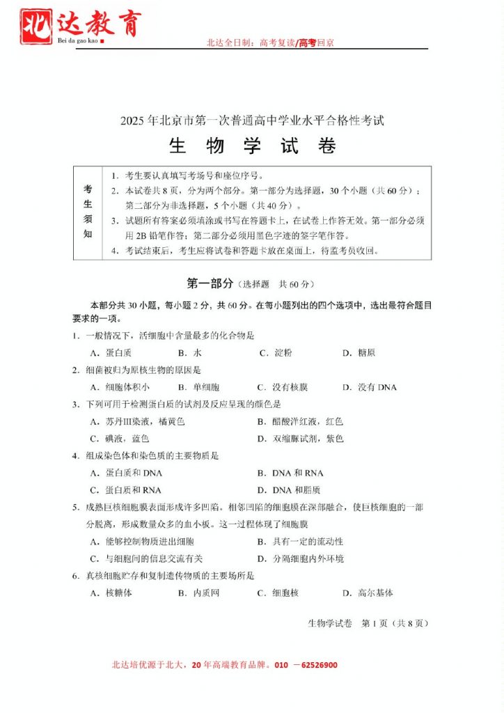 2025北京高中第一次合格考已结束,为了方便同学们了解各科试题情况,admw360教研组整理了2025北京高中第一次合格考生物试题及答案,需要的小伙伴赶紧下载练习起来吧: