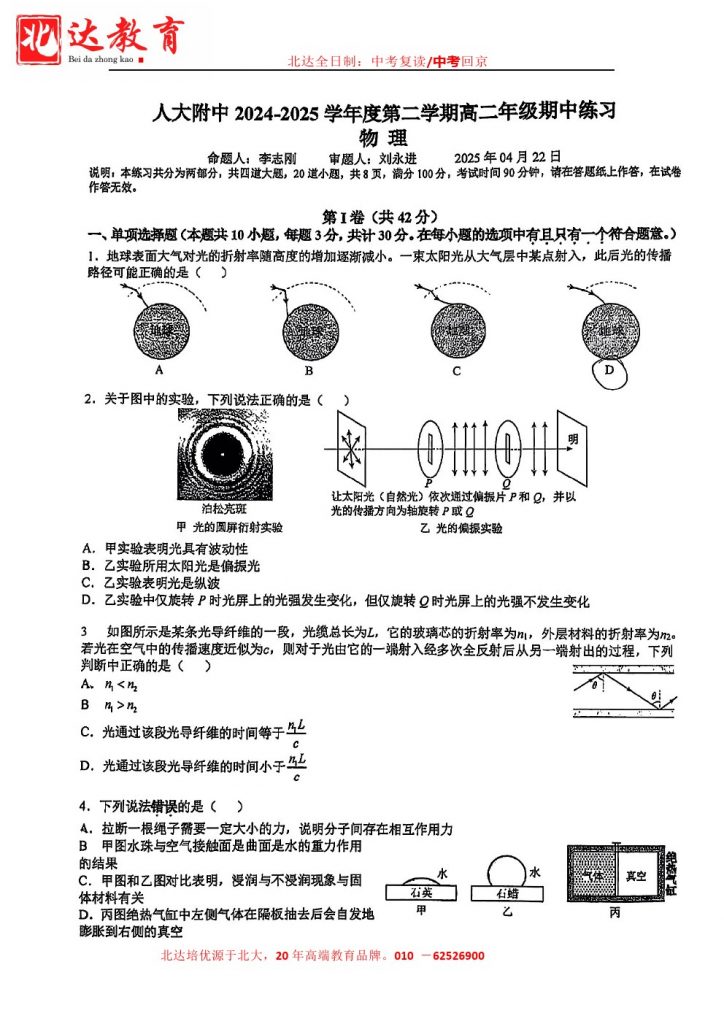 2025北京各区高二期中考已陆续开始,admw360教研组整理了2025北京人大附中高二(下)期中物理试题,分享给大家。