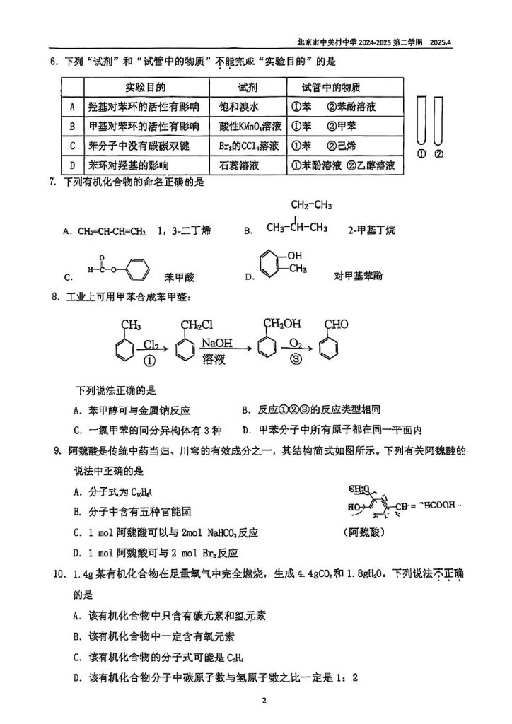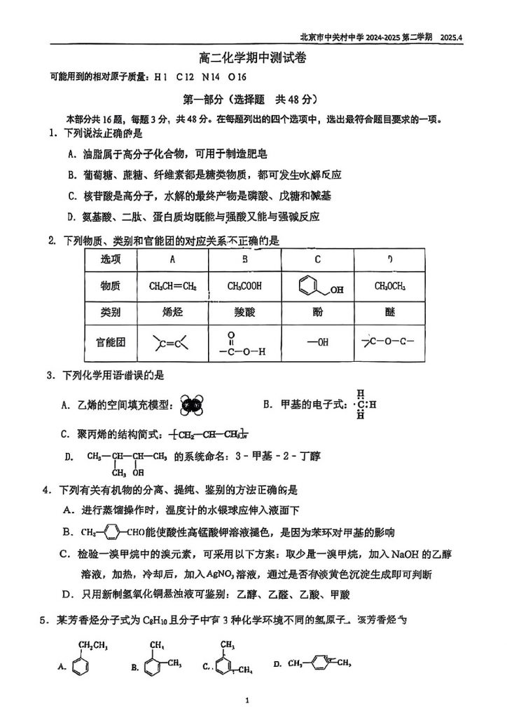 2025北京各区高二期中考已陆续开始,admw360教研组整理了2025北京中关村中学高二(下)期中化学试题,分享给大家。