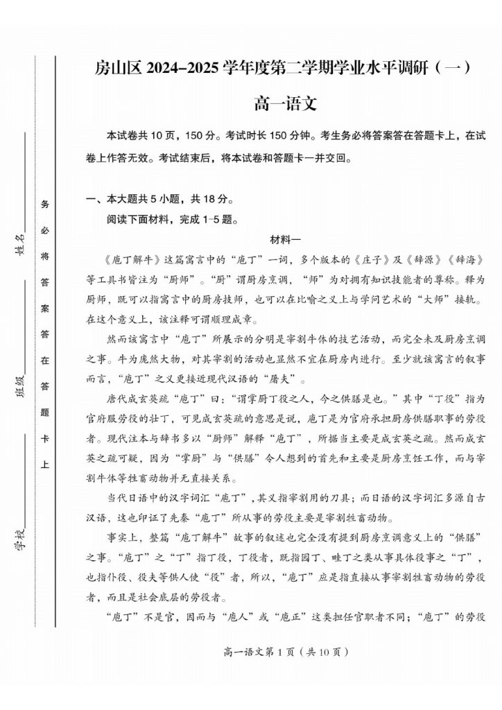 2025北京各区高一期中考已陆续开始,admw360教研组整理了2025北京房山高一(下)期中语文试题,分享给大家。