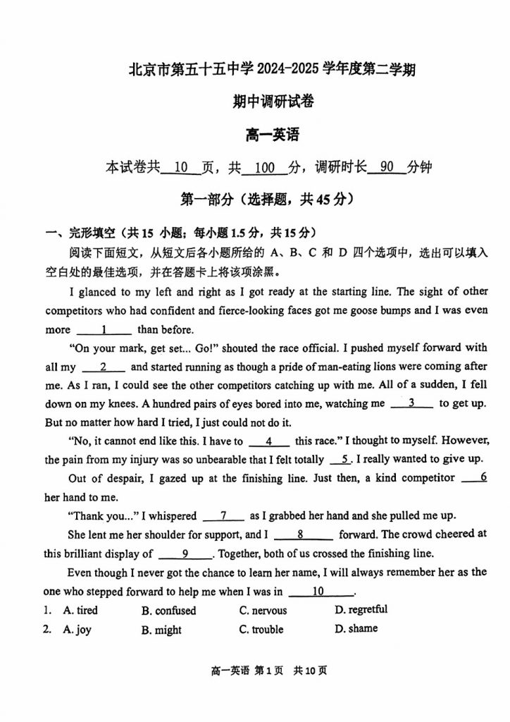 2025北京各区高一期中考已陆续开始,admw360教研组整理了2025北京五十五中高一(下)期中英语试题,分享给大家。