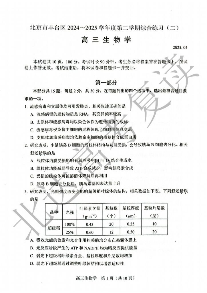 北京2025高三二模正在陆续进行中,为方便大家对答案、下载练习等,小编给大家搜集了北京丰台2025高三二模生物试题及答案,需要的小伙伴赶紧下载练习起来吧: