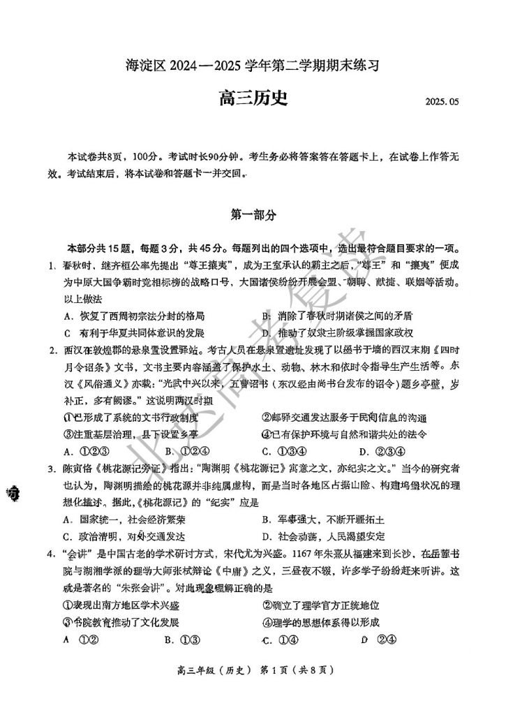 北京2025高三二模正在陆续进行中,为方便大家对答案、下载练习等,小编给大家搜集了北京海淀2025高三二模历史试题及答案,需要的小伙伴赶紧下载练习起来吧: