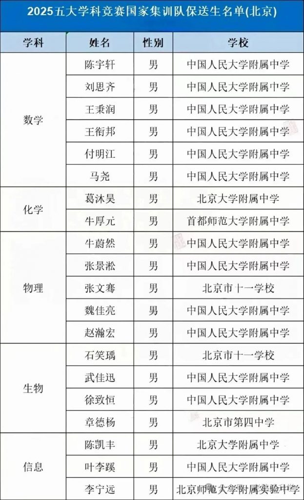 2025五大学科竞赛国集保送生名单出炉,北京20人保送清北!人大附中独占鳌头!以下是admw360教育整理的内容详情,一起来看: