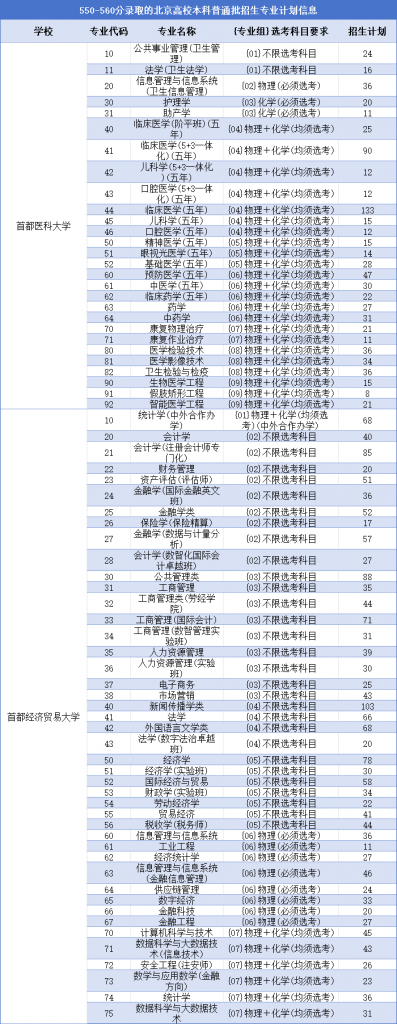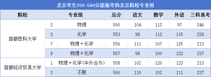 北京考生550-560分可以报考的北京高校有2所,主要包括首都医科大学、首都经济贸易大学。具体详见上表。