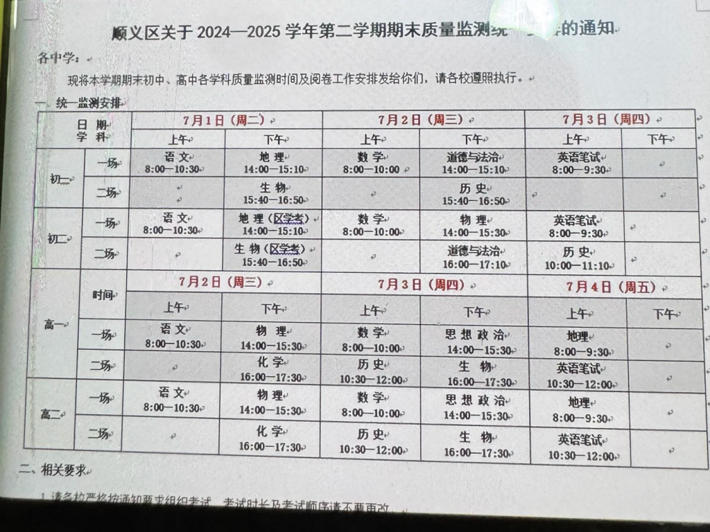 顺义高一高二考试时间为7月1日到7月3日,顺义高一高二考试时间为7月2日到7月4日,各科考试安排在上图可查看。