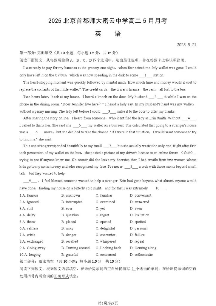 2025年北京各中学高二5月月考已结束,小编整理了首都师大密云中学2025高二5月考英语试题及答案,分享给大家。