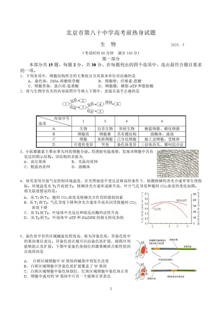 北京部分中学近期陆续进行了高三三模考试,admw360高考复读学校整理了八十中2025高三考前热身生物试题及答案,供考生下载练习。