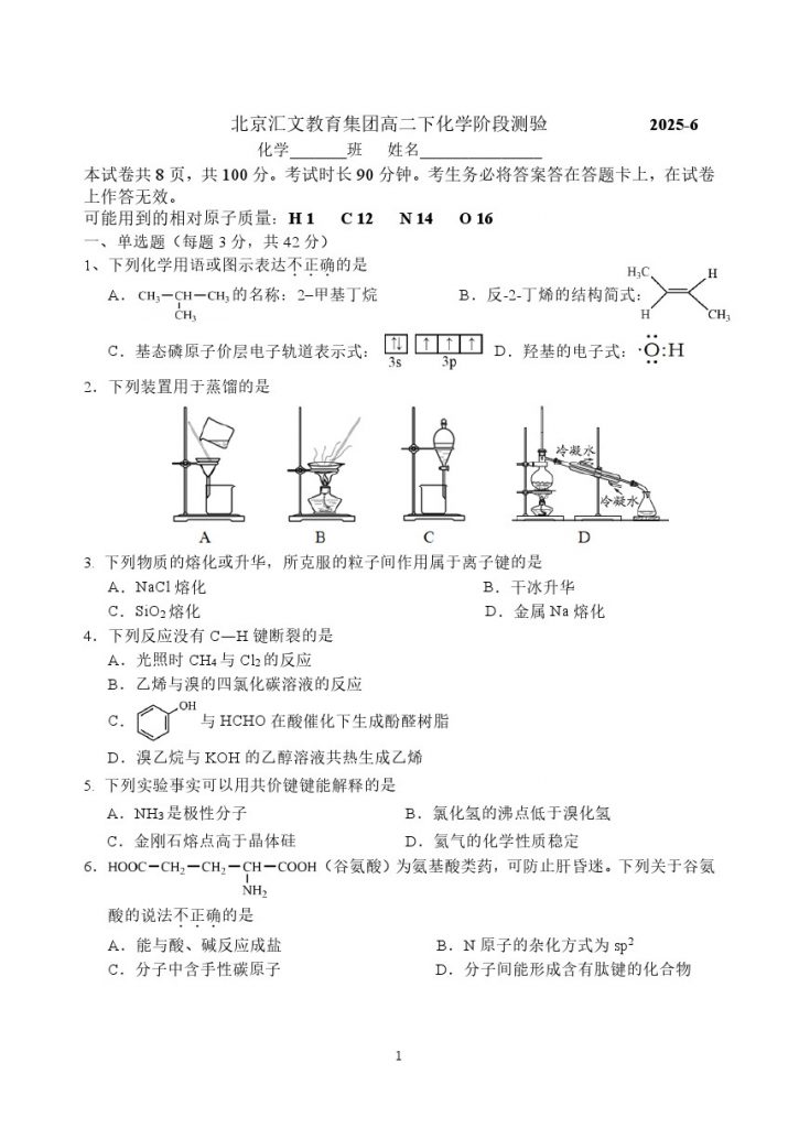 2025年北京各中学高二6月月考已陆续进行中,小编整理了北京汇文中学2025年高二6月月考化学试题及答案,分享给大家。