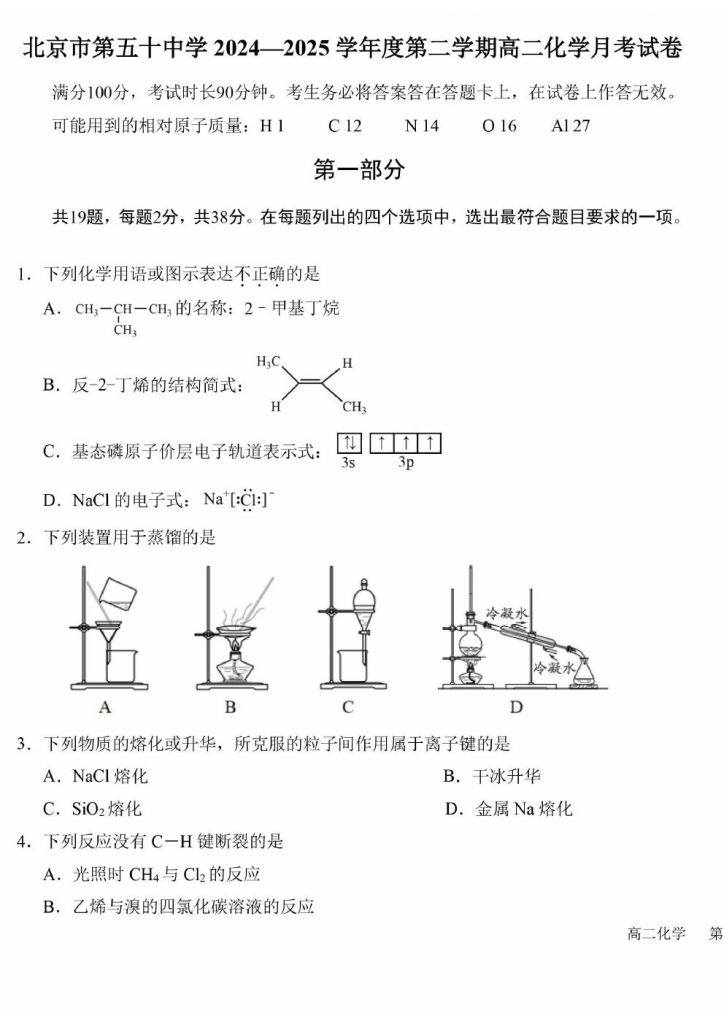 2025年北京各中学高二6月月考已陆续进行中,小编整理了2025北京五十中高二6月月考化学试题,分享给大家。