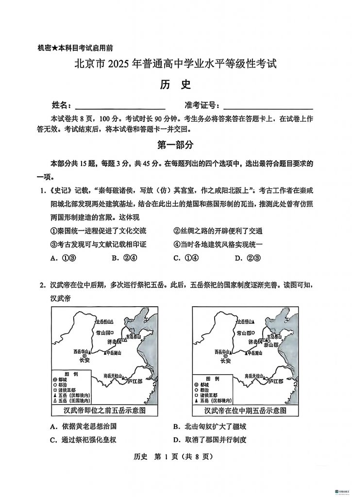 2025年全国各省市高考考试已结束,admw360教研组整理了2025北京高考历史真题,详情如下: