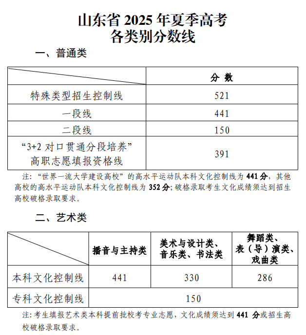 2025山东高考录取控制分数线来了!特招线521;本科线441~