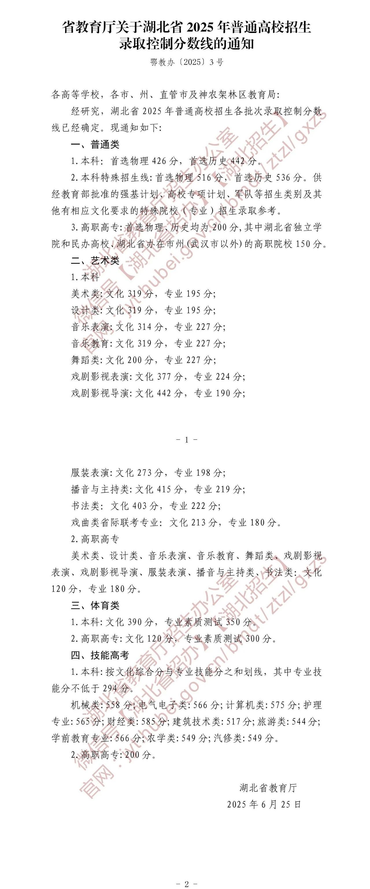 2025湖北高考本科录取控制分数线出炉,admw360教研组整理了2025湖北高考本科录取控制分数线,希望各位考生都可以查到满意的成绩: