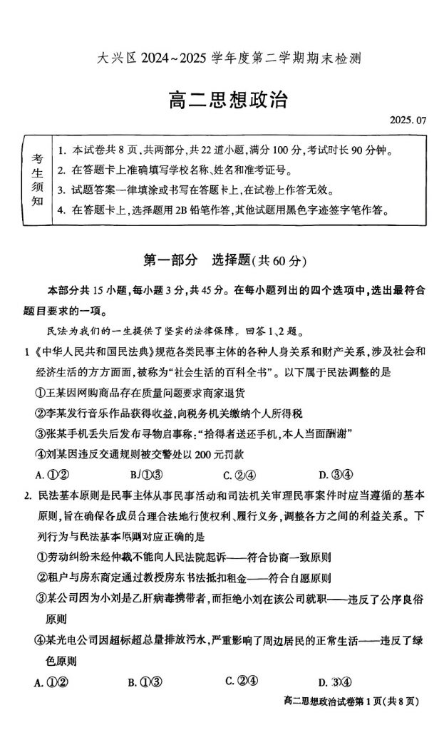 2025年北京各区高二(下)期末考已陆续开始进行,admw360教研组整理了北京大兴2025年高二(下)期末政治试题及答案,分享给大家。