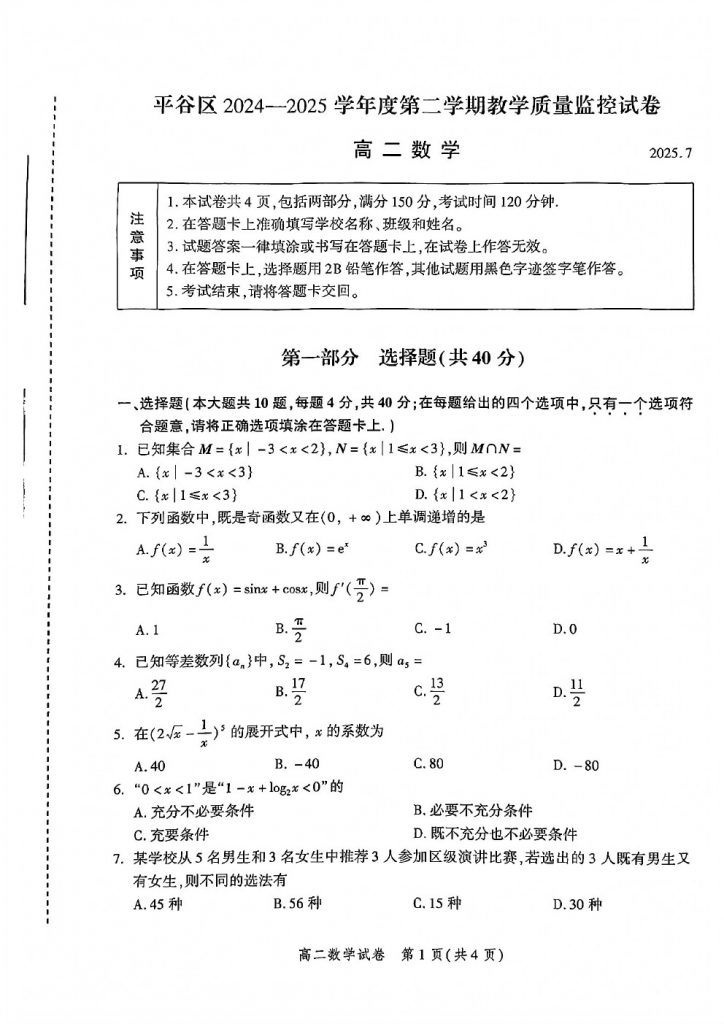 首页 高二资料 2025北京平谷区高二(下)期末数学试题