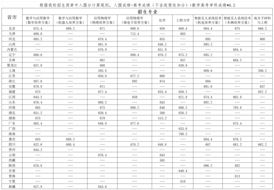 我校2025年强基计划学校考核入围结果已发布,请考生登录强基计划报名系统(https://bm.chsi.com.cn/jcxkzs/sch/10007)查询本人入围结果。第一类考生入围分数线见下图,第二类考生按照简章中的标准入围。