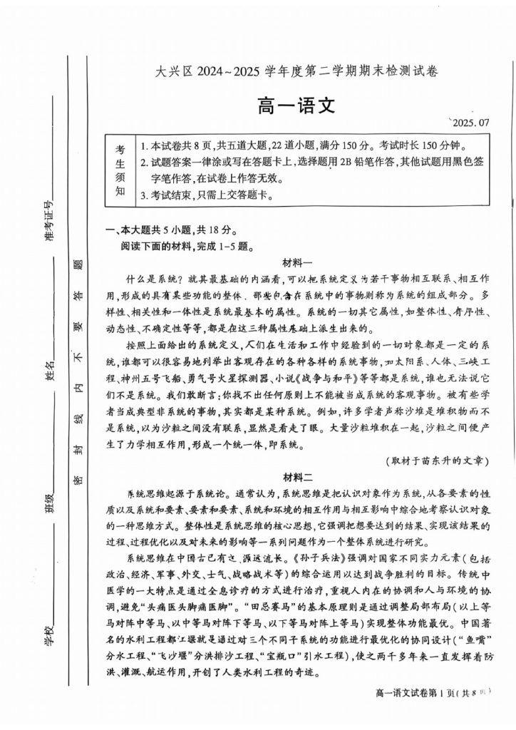 2025年北京各区高一(下)期末考已陆续开始进行,admw360教研组整理了2025北京大兴高一(下)期末语文试题,分享给大家。