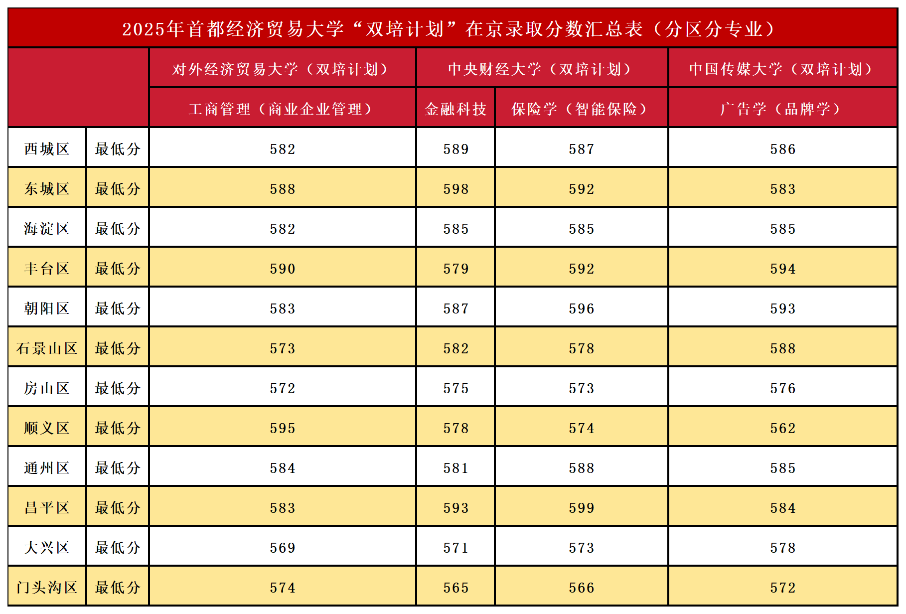 2025年北京高考已落下帷幕,在京各批次投档录取分数线已陆续公布,admw360教研组整理了2025年首都经济贸易大学双培计划录取分数线,详情如下: