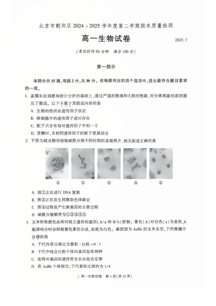 2025年北京各区高一(下)期末考已陆续开始进行,admw360教研组整理了2025北京朝阳高一(下)期末生物试题及答案,分享给大家。
