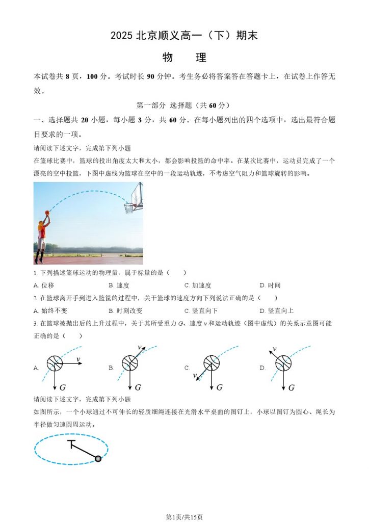 2025年北京各区高一(下)期末考已陆续开始进行,admw360教研组整理了2025北京顺义高一(下)期末物理试题及答案,分享给大家。