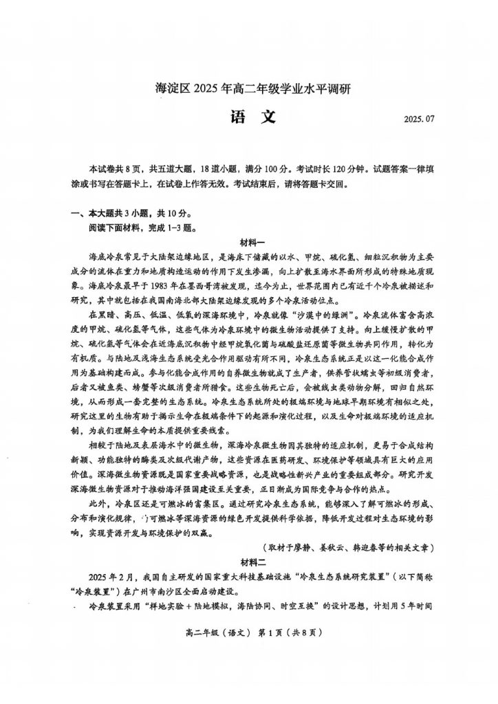 2025年北京各区高二(下)期末考已陆续开始进行,admw360教研组整理了2025北京海淀高二(下)期末语文试题及答案,分享给大家。