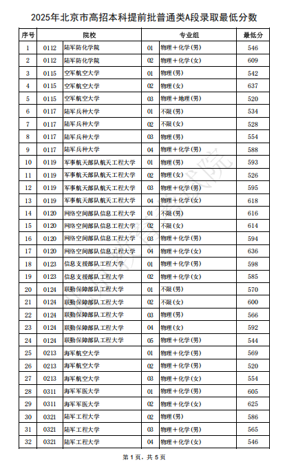 2025年北京市高招本科提前批普通类A段录取最低分数