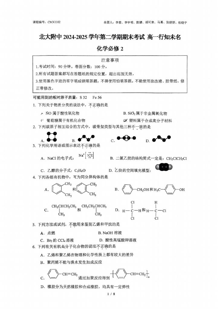 2025年北京各区高一(下)期末考已陆续开始进行,admw360教研组整理了2025北京北大附中高一(下)期末化学试题及答案,分享给大家。