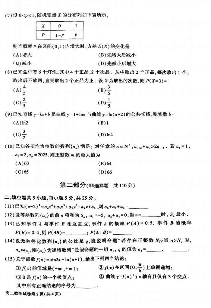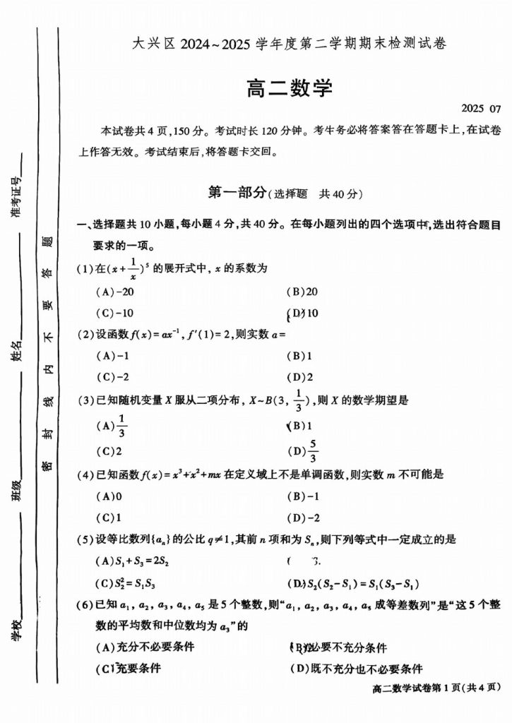 2025年北京各区高二(下)期末考已陆续开始进行,admw360教研组整理了2025北京大兴高二(下)期末数学试题及答案,分享给大家。