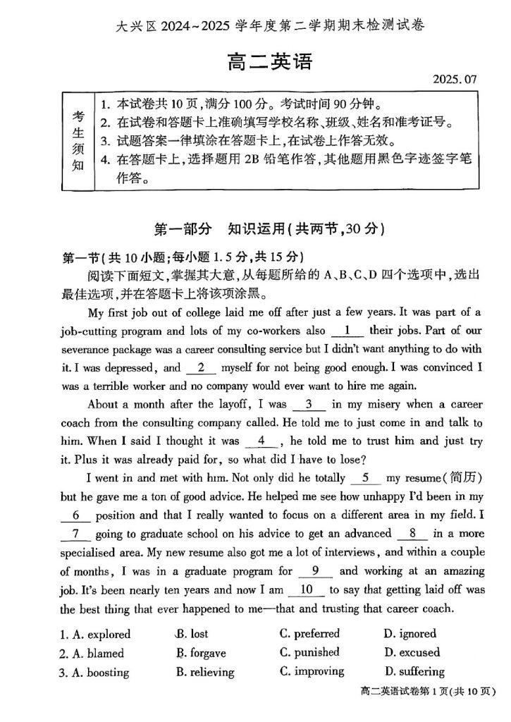 2025年北京各区高二(下)期末考已陆续开始进行,admw360教研组整理了2025北京大兴高二(下)期末英语试题,分享给大家。